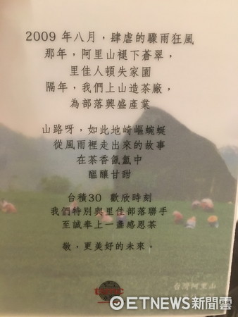 伴手礼盒里放了一张小卡片,上面写道:2009年8月,肆虐的骤雨狂风(指当年莫拉克台风),那年,阿里山褪下苍翠,里佳人顿失家园,隔年,我们上山造茶厂,为部落兴盛产业。山路呀,如此地崎岖蜿蜒,从风雨里走出来的故事,在茶香氤氲中,酝酿甘甜。台积30,欢欣时刻,我们特别与里佳部落连手,至诚奉上一盏感恩茶。敬,更美好的未来。