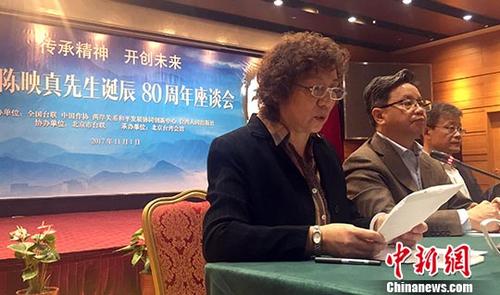 11月1日,纪念陈映真先生诞辰八十周年座谈会在北京台湾会馆举办。陈映真夫人陈丽娜(左1)在会上提出,希望在台湾成立陈映真纪念馆,让台湾人不要忘记台湾文学中的爱国主义传统。 中新社记者 路梅 摄