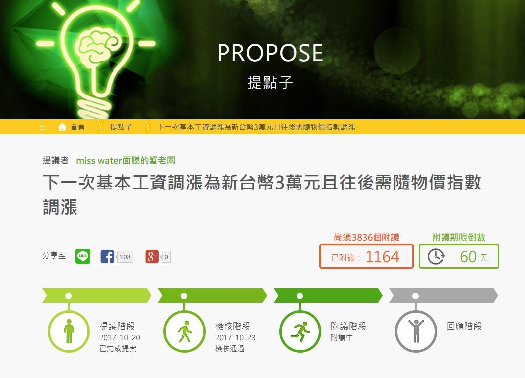 提议者谈到根据2016年主计处的统计资料,台湾人均GDP为22540美元,但台湾民众却没有如此的薪资待遇,他认为其劳动成果已被剥削;还指出,若没加入随物价指数调涨的说明,薪资将会被通货膨胀所抵消。
