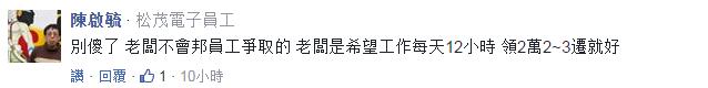 更针对物价上涨的质疑直言道,台湾劳工心态很奇怪,讨论着基本工资涨到3万物价会调涨,但这根本不是劳工该烦恼的部分,因为物价的调涨不是你能干预的,有能力涨价的只有资方。还说,既然劳工只能被动接受资方涨价,那现在担心这些有何意义?从油电双涨到一例一休,物价涨了不少,你的薪资涨了吗?