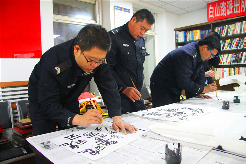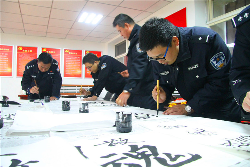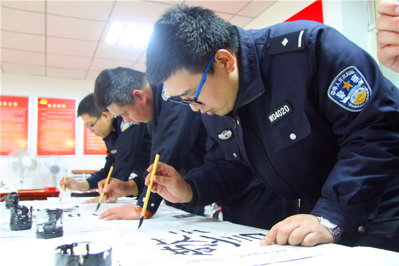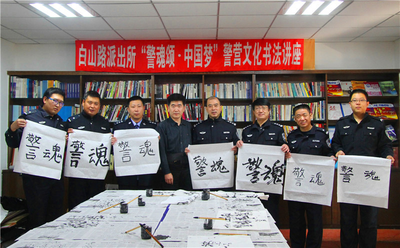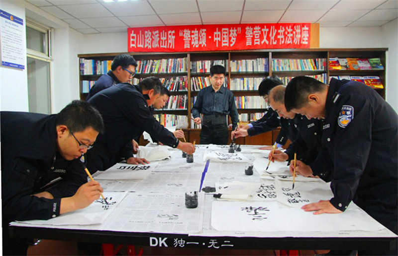 11月11日上午,大连市沙河口区白山路派出所,邀请「中国文化魂书画研究院」副院长、「中国海峡两岸书画家协会大连分会」副会长 何涛 先生,来到文化活动室,开展“警魂颂 中国梦”警营文化书法讲座活动。