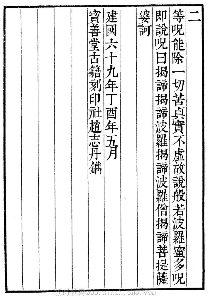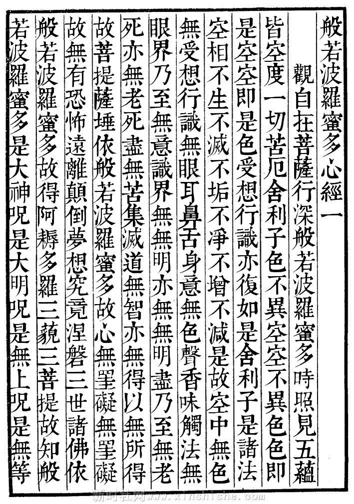 观自在菩萨,行深般若波罗蜜多时,照见五蕴皆空,度一切苦厄。舍利子,色不异空,空不异色,色即是空,空即是色,受想行识,亦复如是。舍利子,是诸法空相,不生不灭,不垢不净,不增不减。是故空中无色,无受想行识,无眼耳鼻舌身意,无色声香味触法,无眼界,乃至无意识界。无无明,亦无无明尽,乃至无老死,亦无老死尽。无苦集灭道,无智亦无得。以无所得故,菩提萨埵,依般若波罗蜜多故,心无挂碍,无挂碍故,无有恐怖,远离颠倒梦想,究竟涅槃。三世诸佛,依般若波罗蜜多故,得阿耨多罗三藐三菩提。故知般若波罗蜜多,是大神咒,是大明咒,是无上咒,是无等等咒,能除一切苦,真实不虚。故说般若波罗蜜多咒,即说咒曰:揭谛揭谛,波罗揭谛,波罗僧揭谛,菩提萨婆诃。