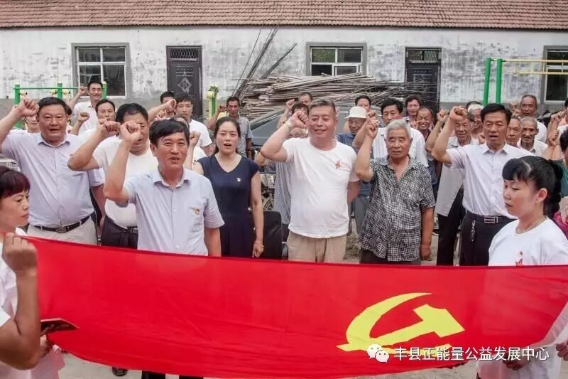 丰县正能量公益发展中心党支部为全体党员每人发放了一件正能量公益服装和一枚崭新的党徽。县总工会主席常敬玉作为领誓人,新老党员一起重温入党誓词。