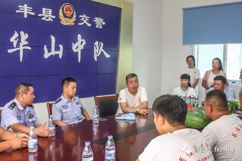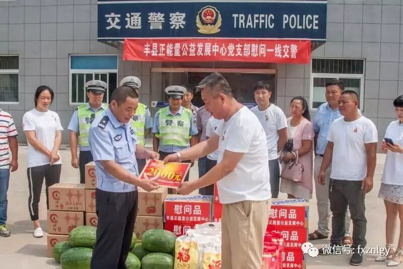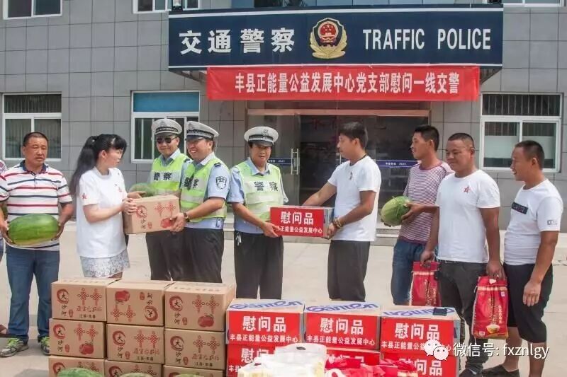 正能量公益7月4日丰县电(高荣光 张丹丹)7月4日,江苏丰县烈日炎炎,气温高达36度。丰县正能量公益发展中心20名党员志愿者在丰县交警大队副大队长王兵的陪同下,来到华山中队看望慰问冒着酷暑奋战在一线执勤的交通民警。党员志愿者为民警带来面粉、大米、食用油、纯净水、水蜜桃、西瓜等水果及夏季降温用品。