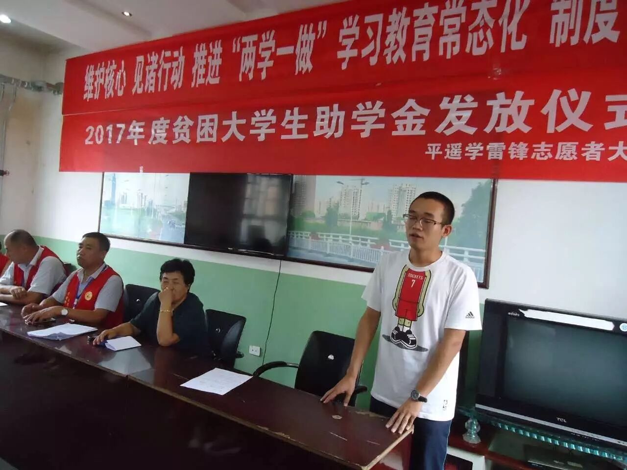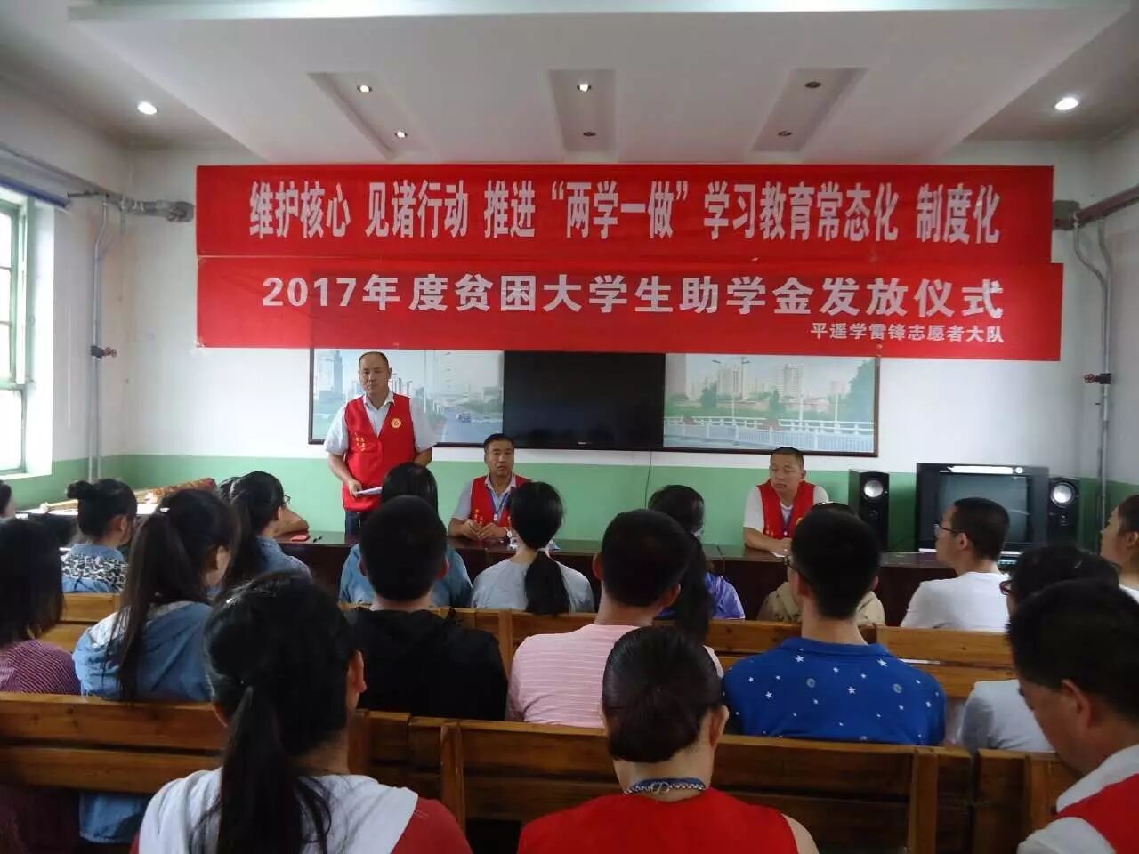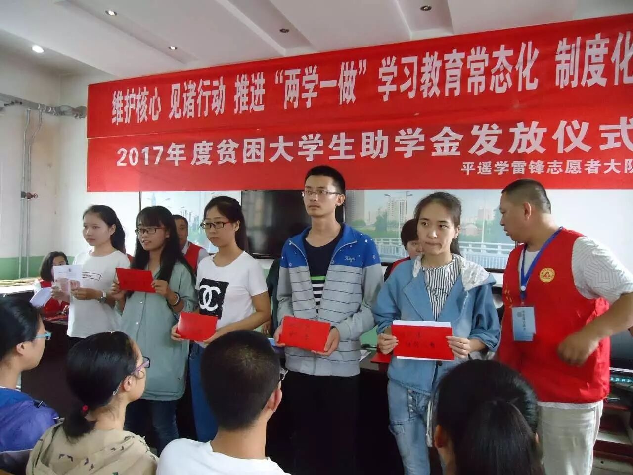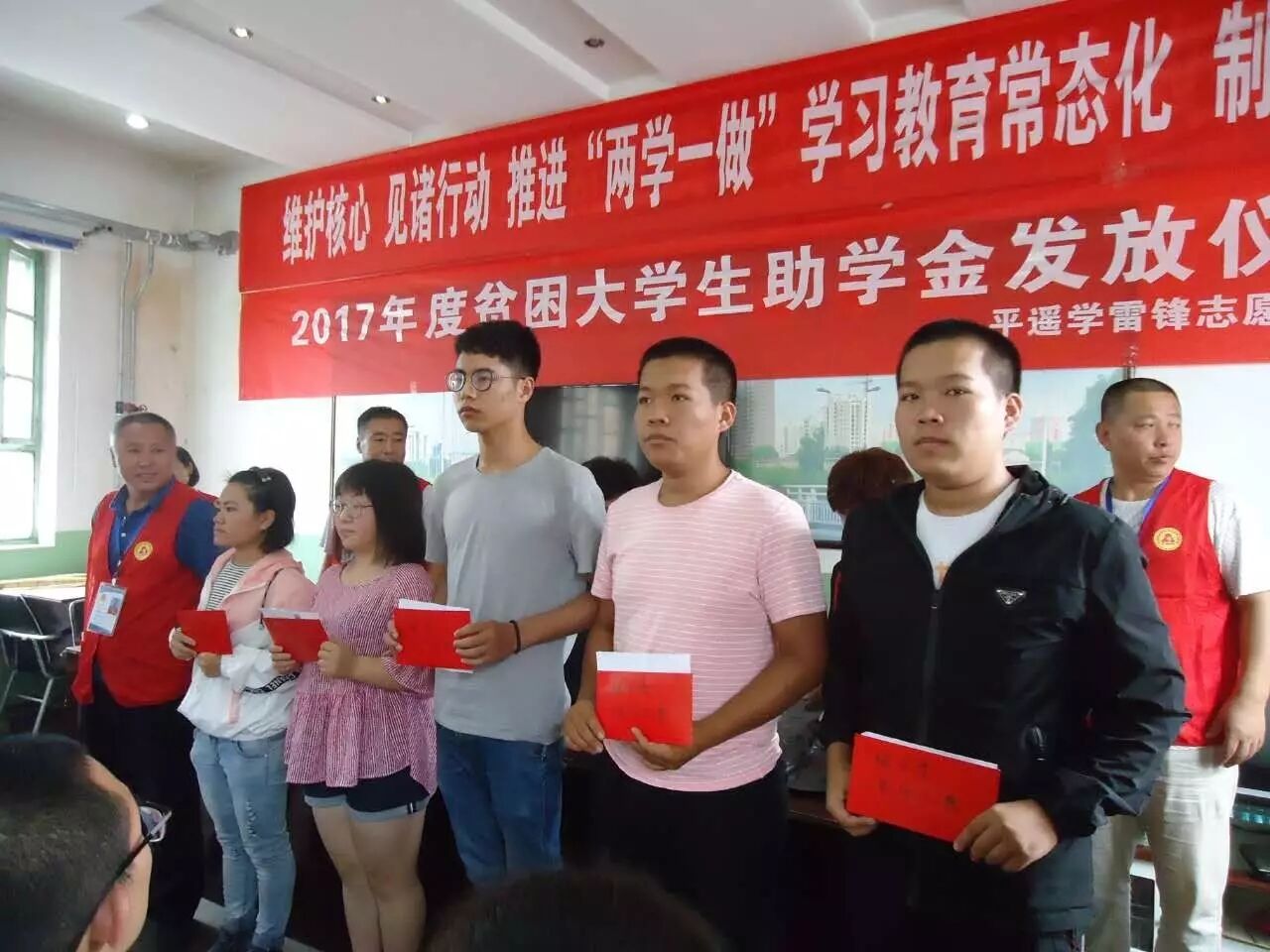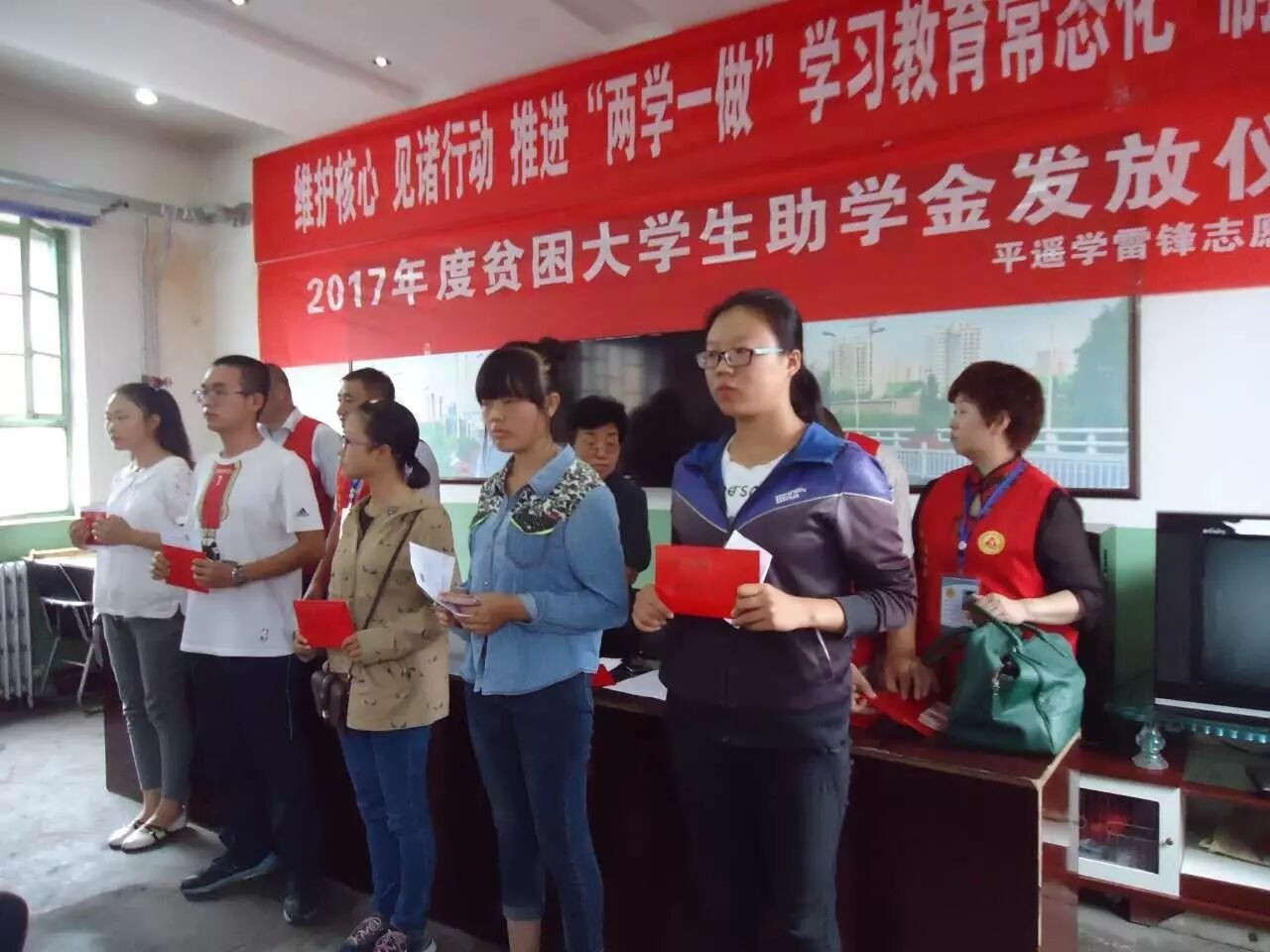 2017年8月22日平遥学雷锋志愿者大队与慈善总会在南城大队为贫困大学生发放了助学金,2017年爱心一帮一有6名,义卖字画受资助的有3名,2017年义卖字画资金承接2016年被资助的大学生6名。平遥学雷锋志愿者大队受爱心人士委托,对2016年爱心一帮一资助的大学生今年又给发放了助学金。