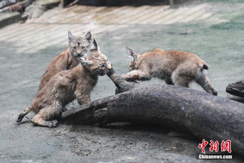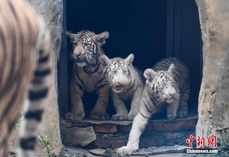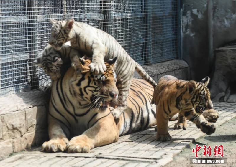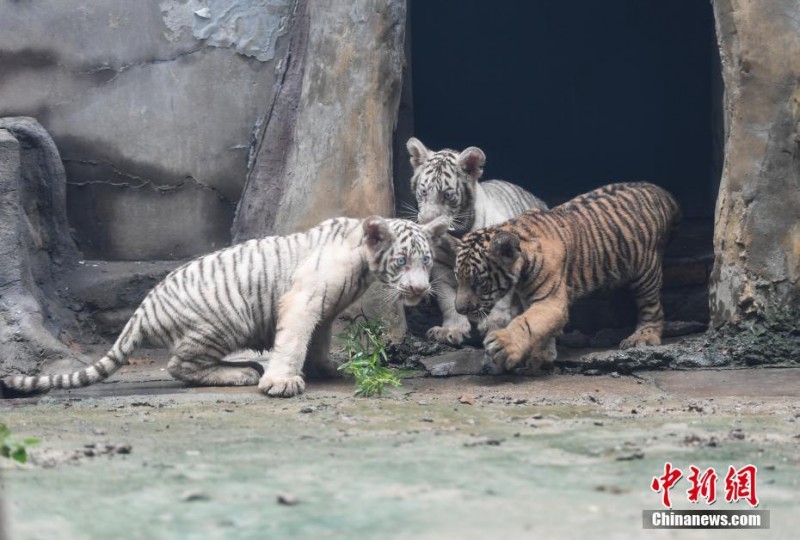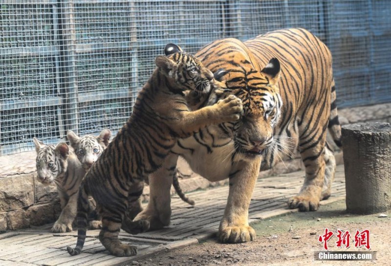 9月6日,在济南动物园诞生的孟加拉虎三胞胎迎来百日,三只虎宝宝在虎***呵护下与游人见面。据悉,父母都是孟加拉虎,一胎产下两种毛色三胞胎虎仔实属罕见。中新社记者张勇摄