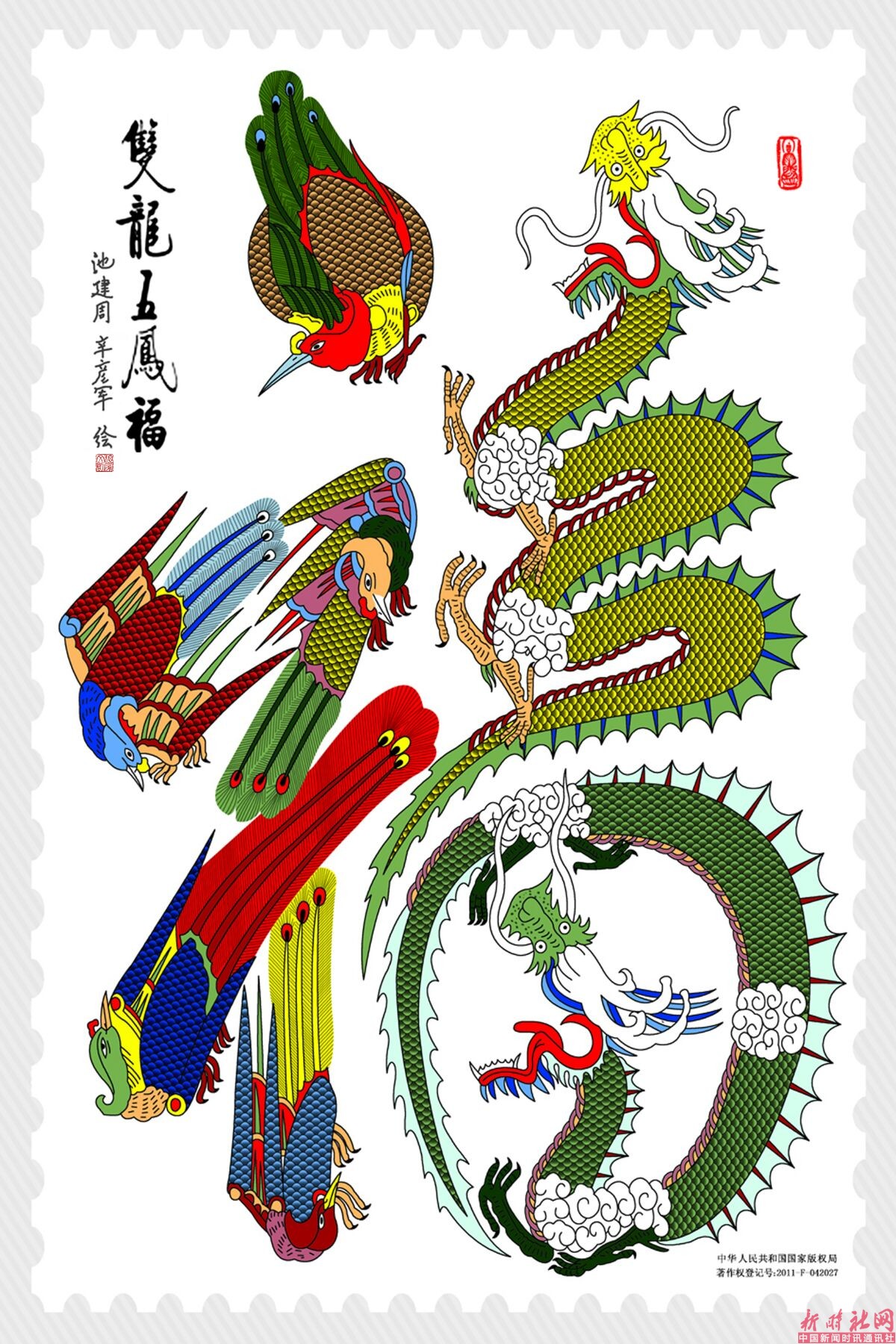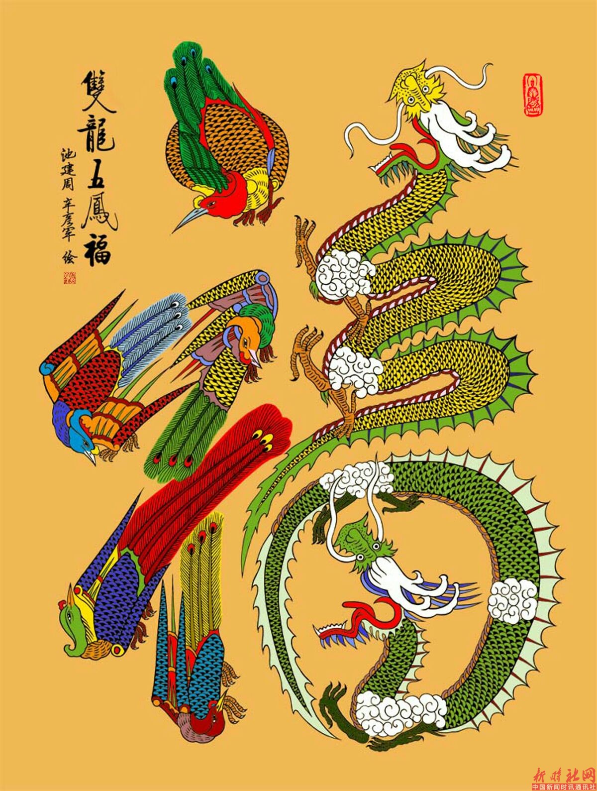 会上,内黄县池家年画坊开发的真丝织锦“双龙五凤福”, 成为展馆的精品之一。该作品不仅吸引了大量的参观者驻足观看、拍照,更吸引来众多商家与之达成订货意向。该作品由两条遨游的龙和五只轻盈飞翔的凤组成的一个“福”字,字融于画,画藏于字,虚实相生,处处显着华美雅致的气息。采用高精度真丝织锦技术,精心制作而成,画面逼真,丝质柔美,不仅全真展现了原作的笔墨神韵,更有丝绸典雅华贵的雍容气度,是书画和织锦两项国粹的完美结合,集欣赏、收藏、馈赠为一体的真丝文化精品。