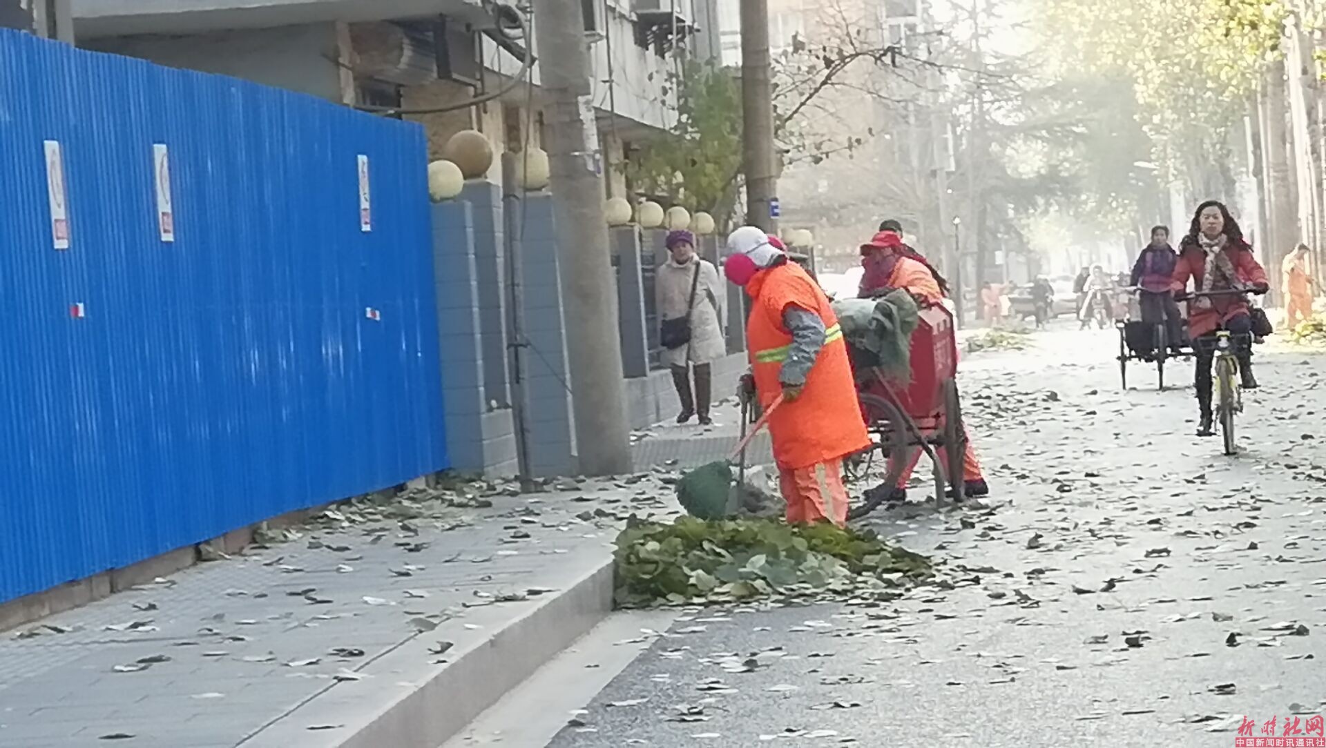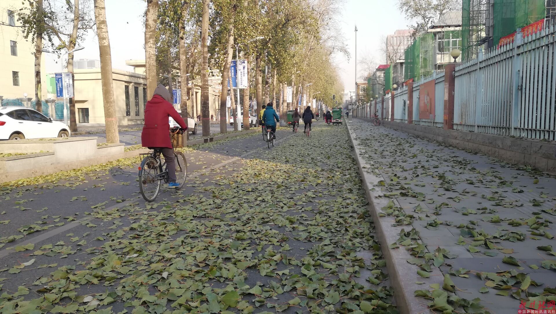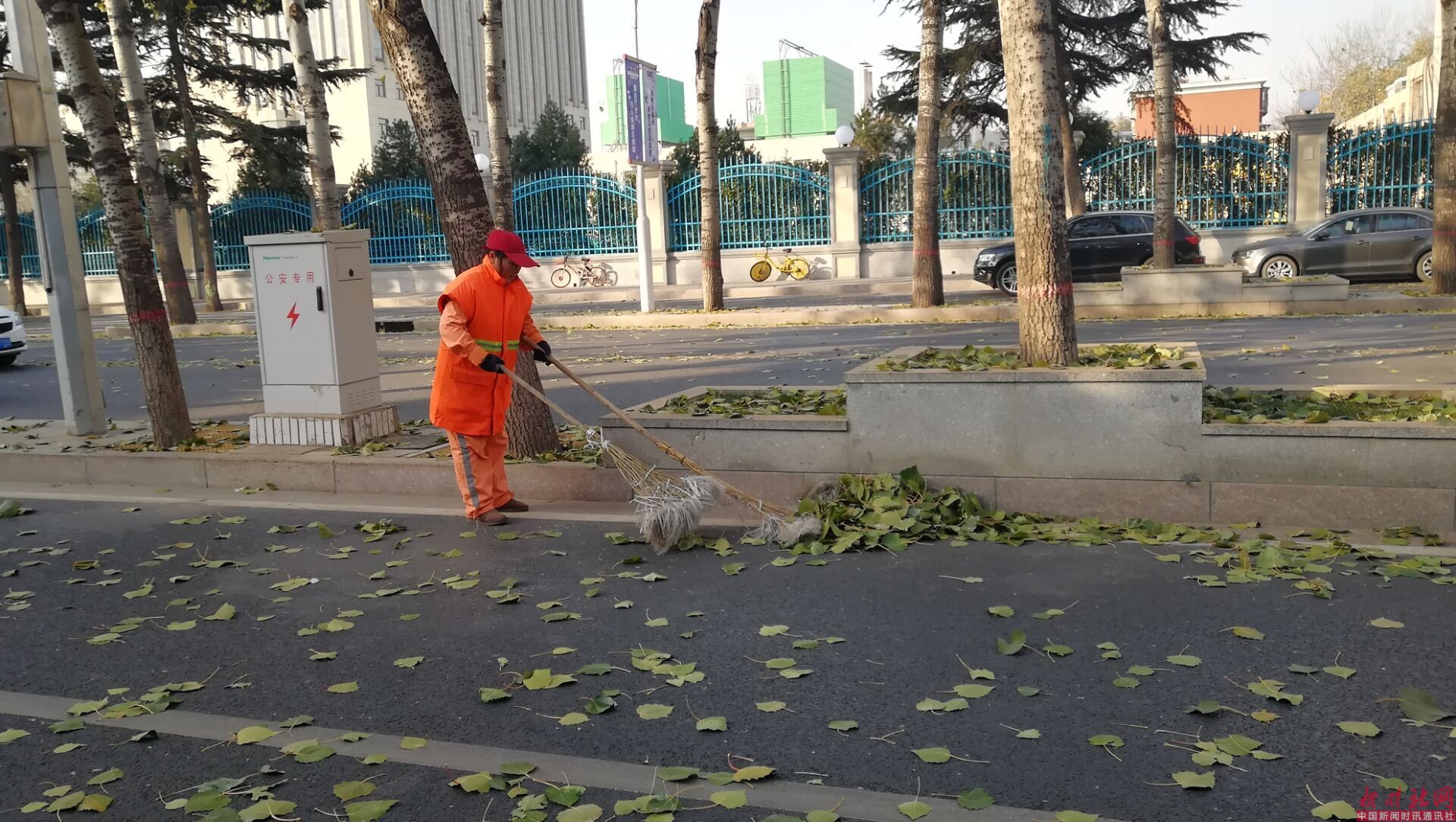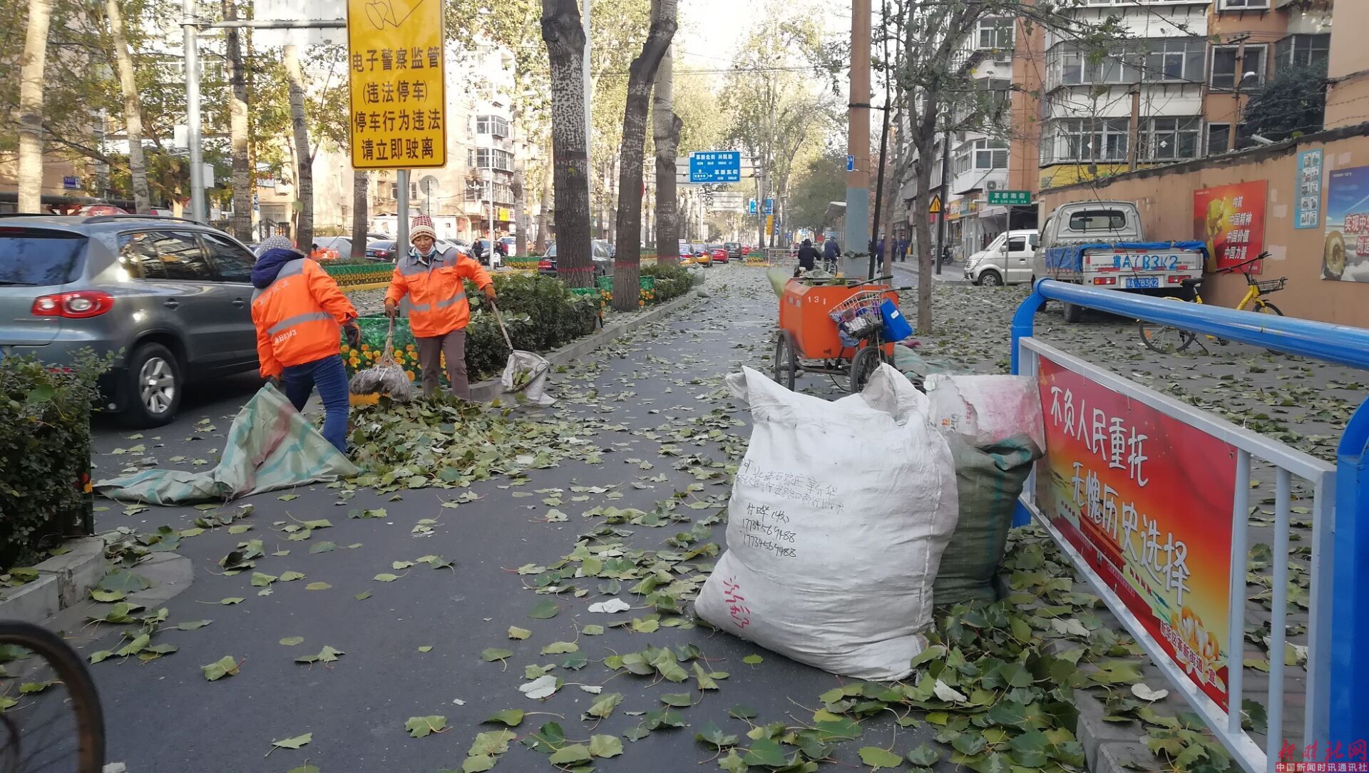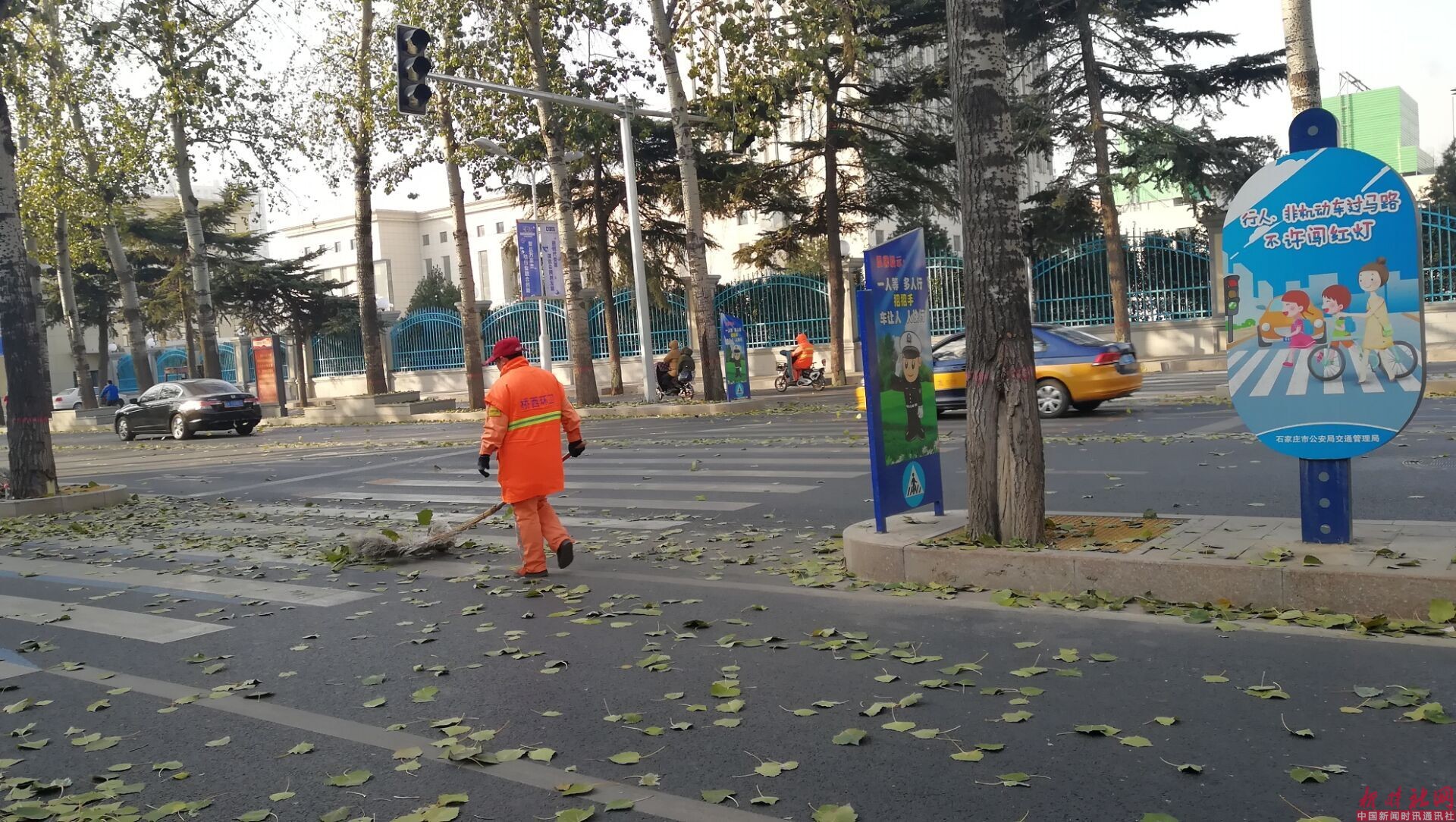 落在地上厚厚一层树叶,会从这里通行的自行车时候会造成滑倒,也影响城市的环境。这种冬日的景色却忙坏了石家庄桥西环卫工人们,他们穿着厚厚的工作服,全副武装,捂得严严实实。在清扫着树叶。落叶也被他们扫成了一堆儿,又装在了麻袋里。可风一直吹树叶一直在落,刚清扫完地面,又被树叶铺满了一层。他们就这样一遍遍的清扫,也有一些无奈,但为了城市的整洁,行人的安全,他们也只好这样一遍一遍的重复。