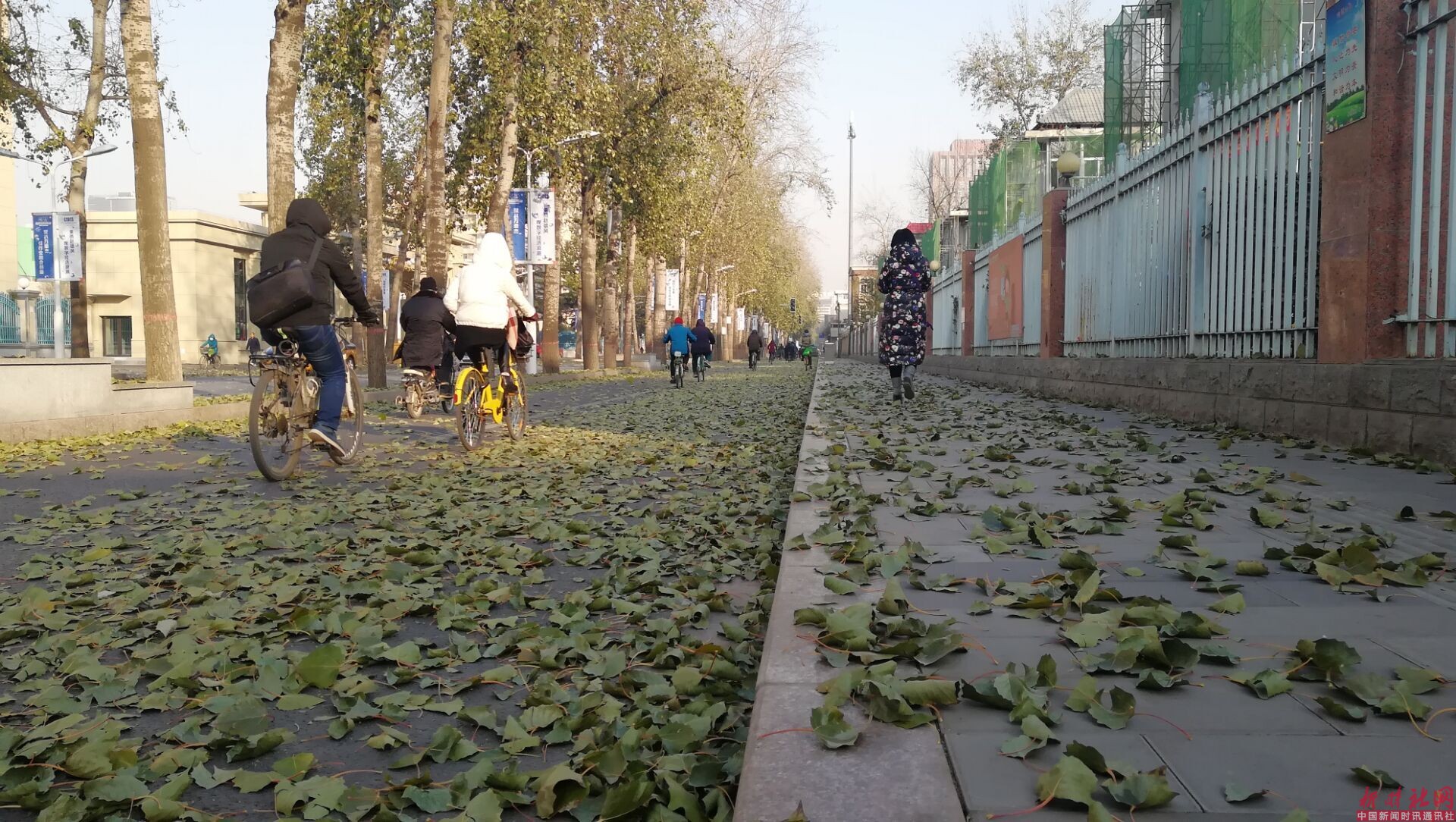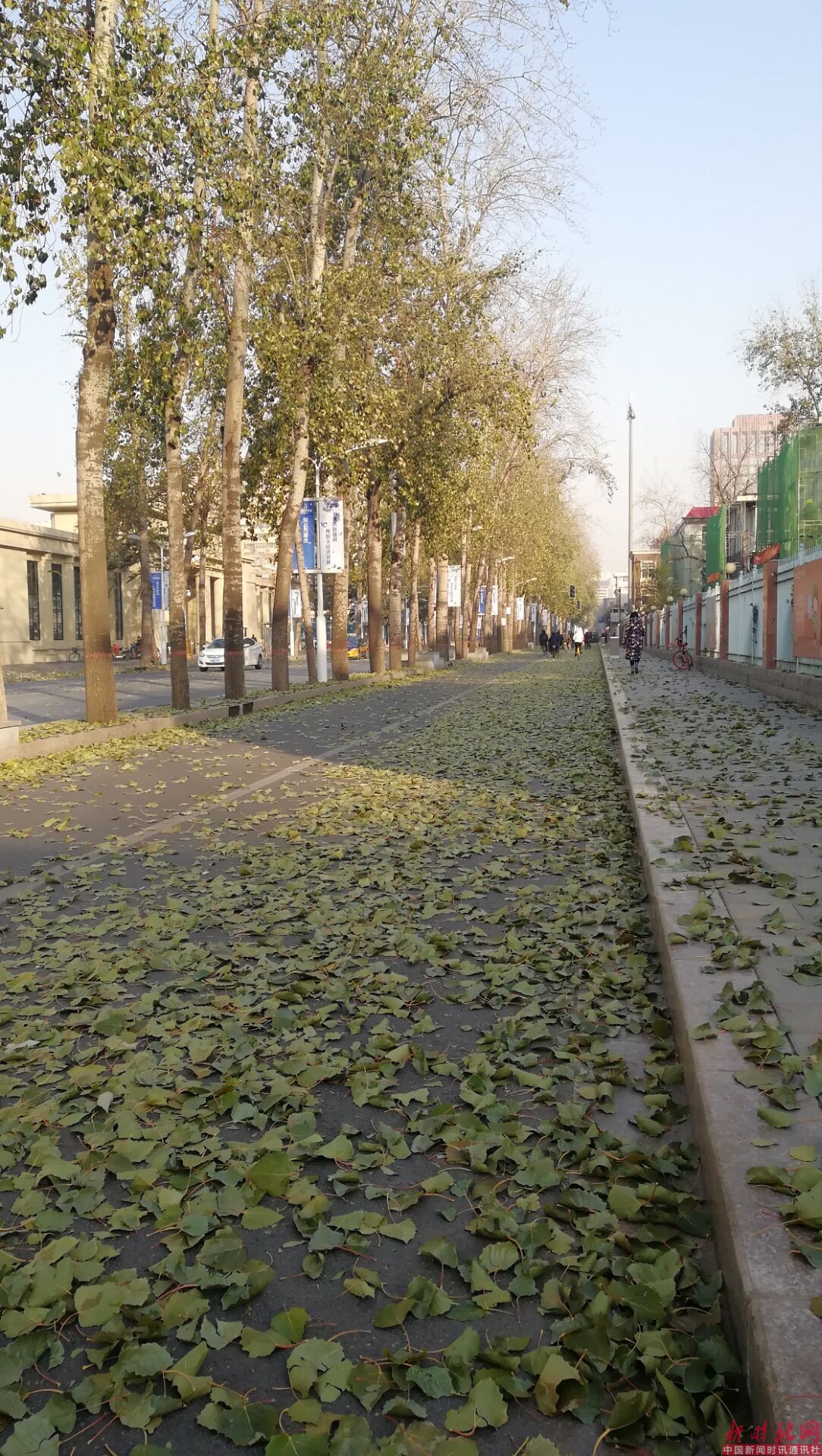 大街两侧种植的是白毛杨树,随着风的吹过,树叶纷纷落地。长长的街道上,铺满了厚厚的一层杨树叶,感觉有一种,欧美街道的风格。不断有行人拿起手机拍照发朋友圈。