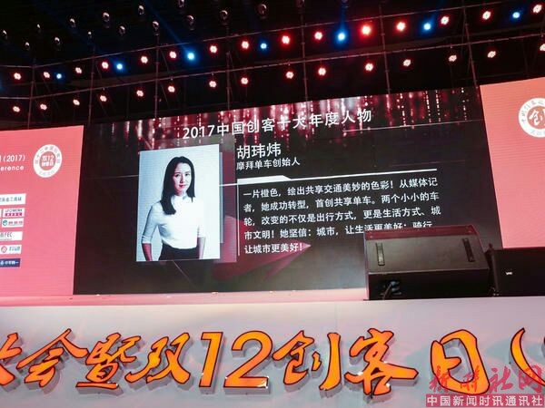 大会揭晓了2017中国创客十大年度人物,摩拜单车创始人胡玮炜名列其中。从媒体记者,她成功转型,首创共享单车。两个小小的车轮,改变的不仅是出行方式,更是生活方式、城市文明!她坚信:城市,让生活更美好;骑行,让城市更美好! 胡玮炜表示,创客应该“创造更美好的世界”希望大家都能为此贡献力量。